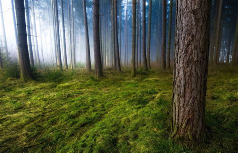 mist, Forest, Grass, Trees, Morning, Sunlight, Green ...