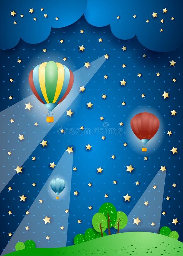 Surreal Landscape By Night With Hot Air Balloons Stock ...