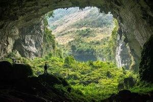 Stone Cave Grass Nature 1080 X 2270. Stone cave, green fern and grass, silhouette of dinosaurs (brontosaur, pterodactyl, diplodocus) and mountains on a blue sky. Summer night landscape - volcano, cave, fern.